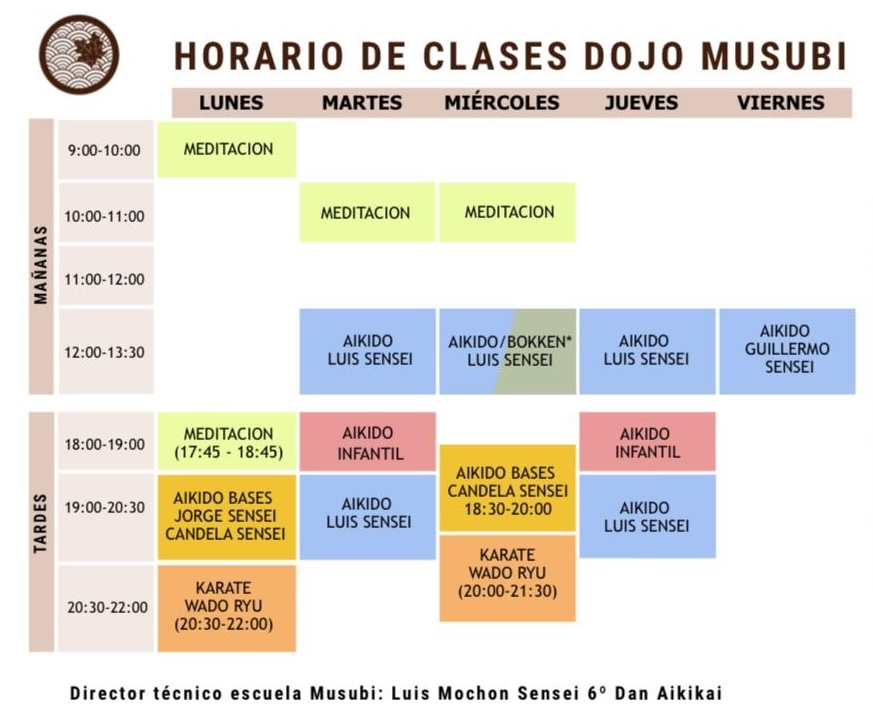 Clases en el Dojo Musubi Granada Director técnico escuela Musubi:Luis Mochón Sensei 6º Dan Aikikai* Los miércoles a las 12:00 y los jueves a las 20:00 habrá clases de manos libres y Bokken en semanas alternas. Teléfonos de interés:AikidoLuis Mochón 646 63 45 09Candela Torres 665 22 74 45Aikido infantilPablo Palacios 610 68 88 35Karate Wado RyuPedro Pérez 629 70 73 19MeditaciónElena Gómez 636 16 71 51